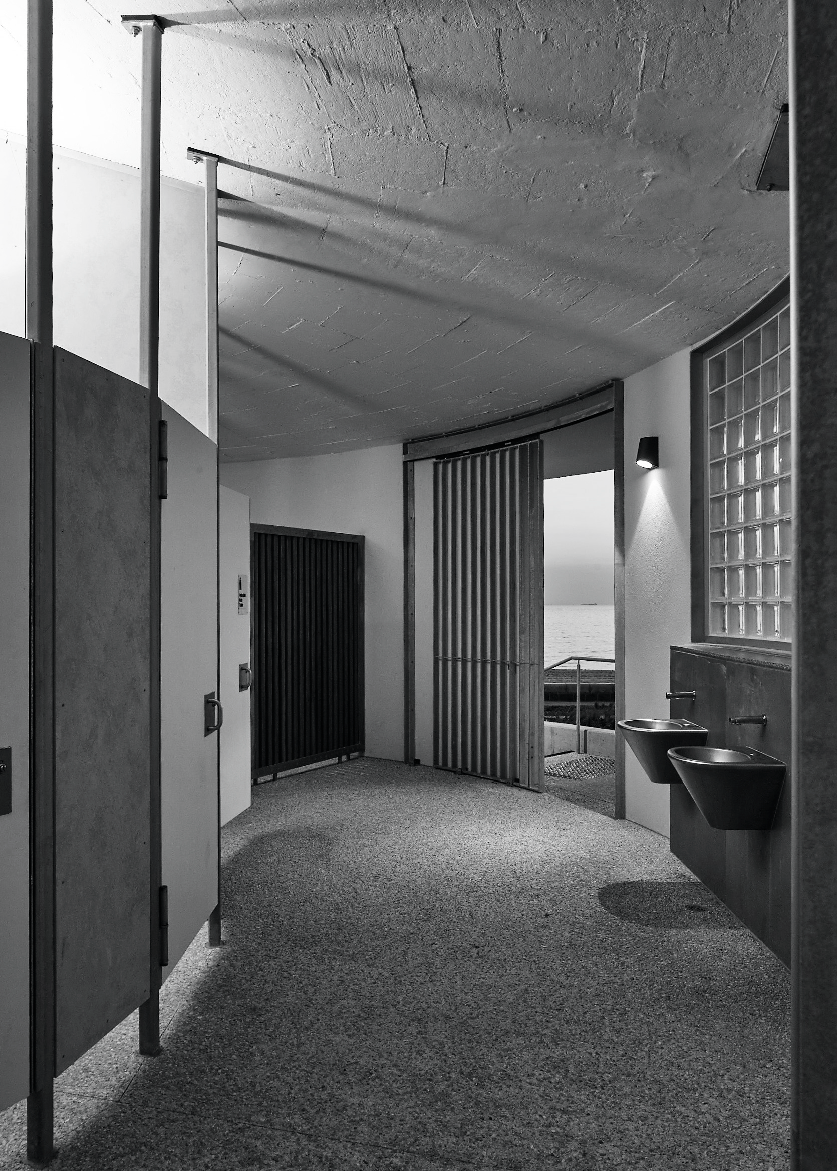 Signage is discreet. Screws and bolts are expressed. Fixtures and panels are industrial, to cope with the corrosive load of the bay’s onshore winds, often underestimated in their impact on paint, timber and other less robust materials. Cubicles are divided by thin steel columns, which make gentle contact with the underside of the roof.