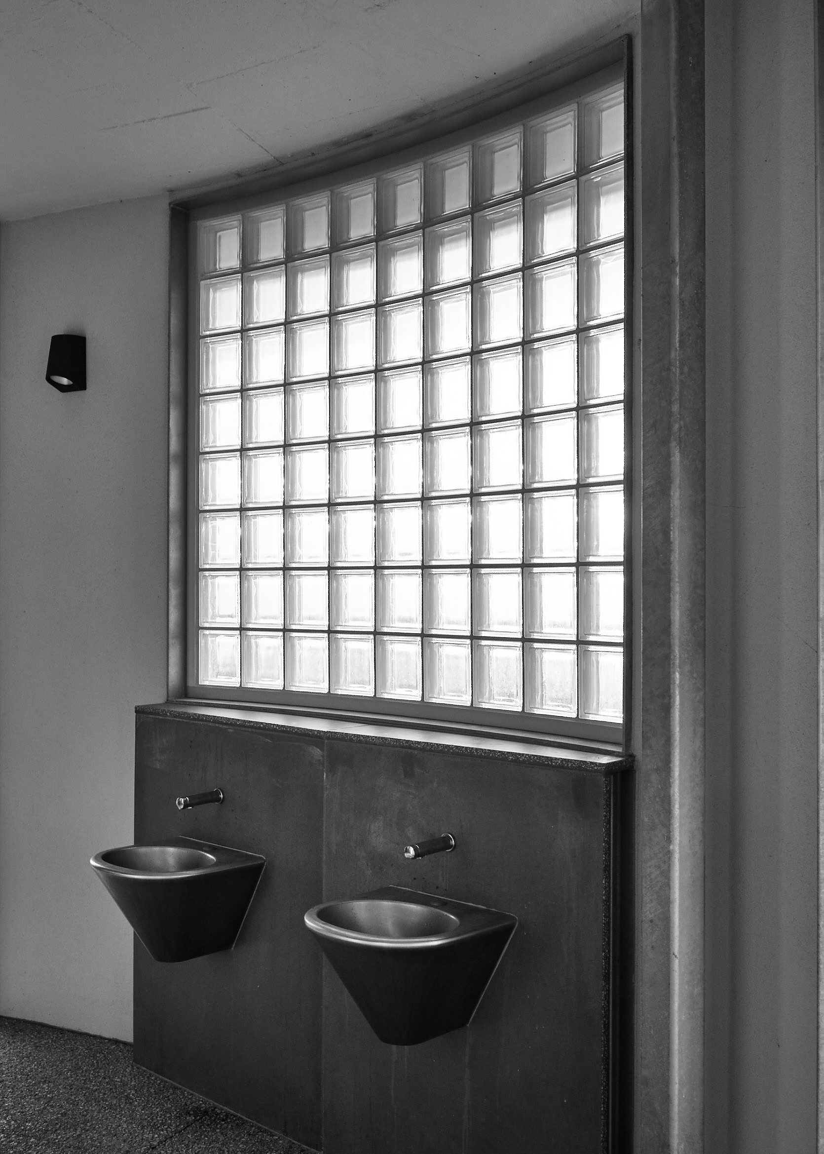Open areas inside are mutually visible, for safety. We introduced glass-block perimeter windows, so interior light creates a lantern effect at night. This was intended to signify public amenity.