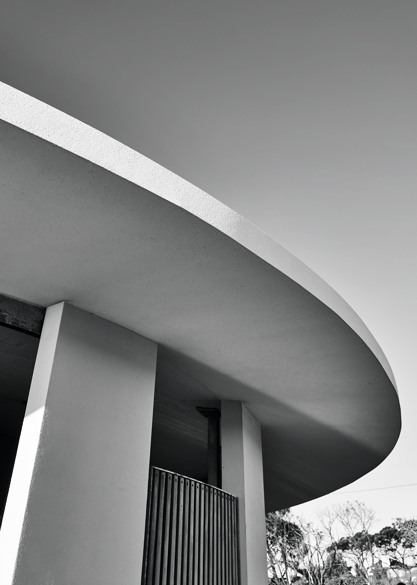 It features an in-situ concrete roof design, without radiating beams. The roof is a thin umbrella supported by a cylinder of concrete-block piers. It forms a circular veranda that links entry points and provides weather protection. The building’s internal ventilation tube, which pierces the roof off-centre, functions as a structural core.