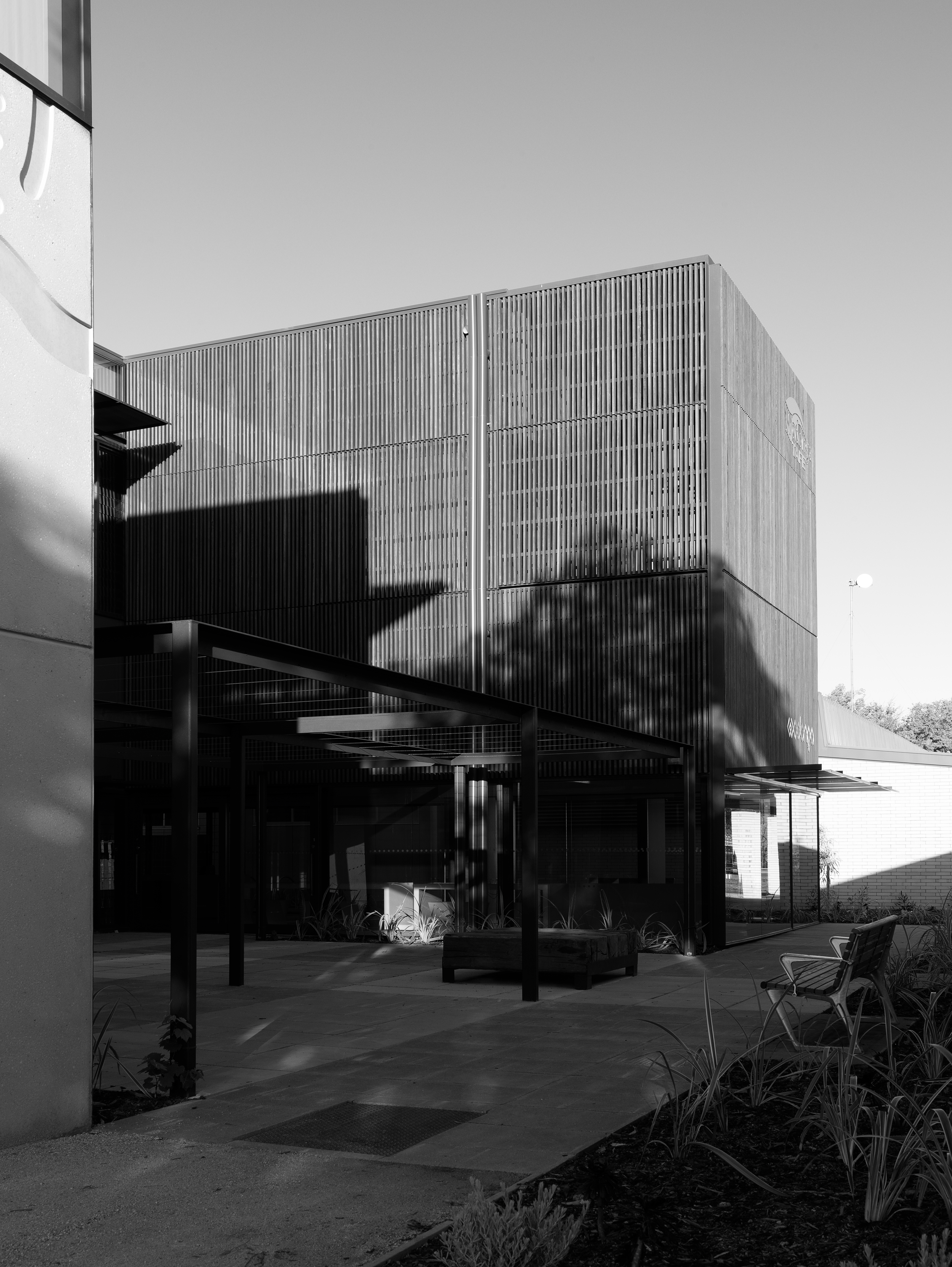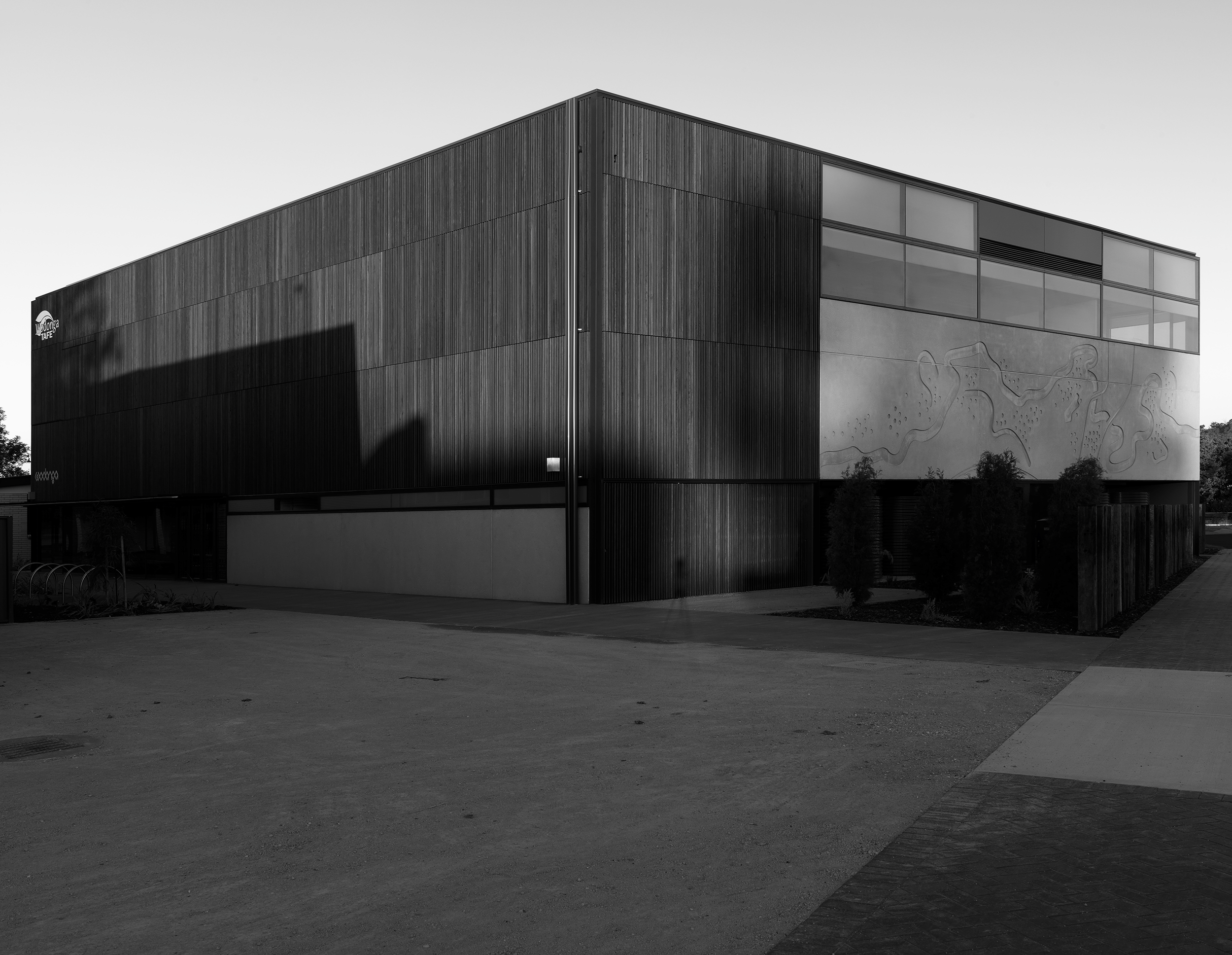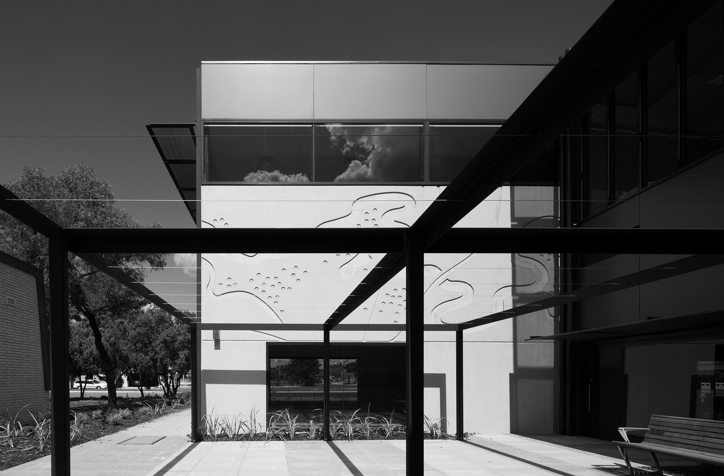 The project was designed, documented and constructed in only a year. It is composed of recyclable materials: glass, steel, timber battens and concrete panels, debossed with an abstraction of the Murray River’s trees and billabongs. It has been received enthusiastically by clients, users and critics.