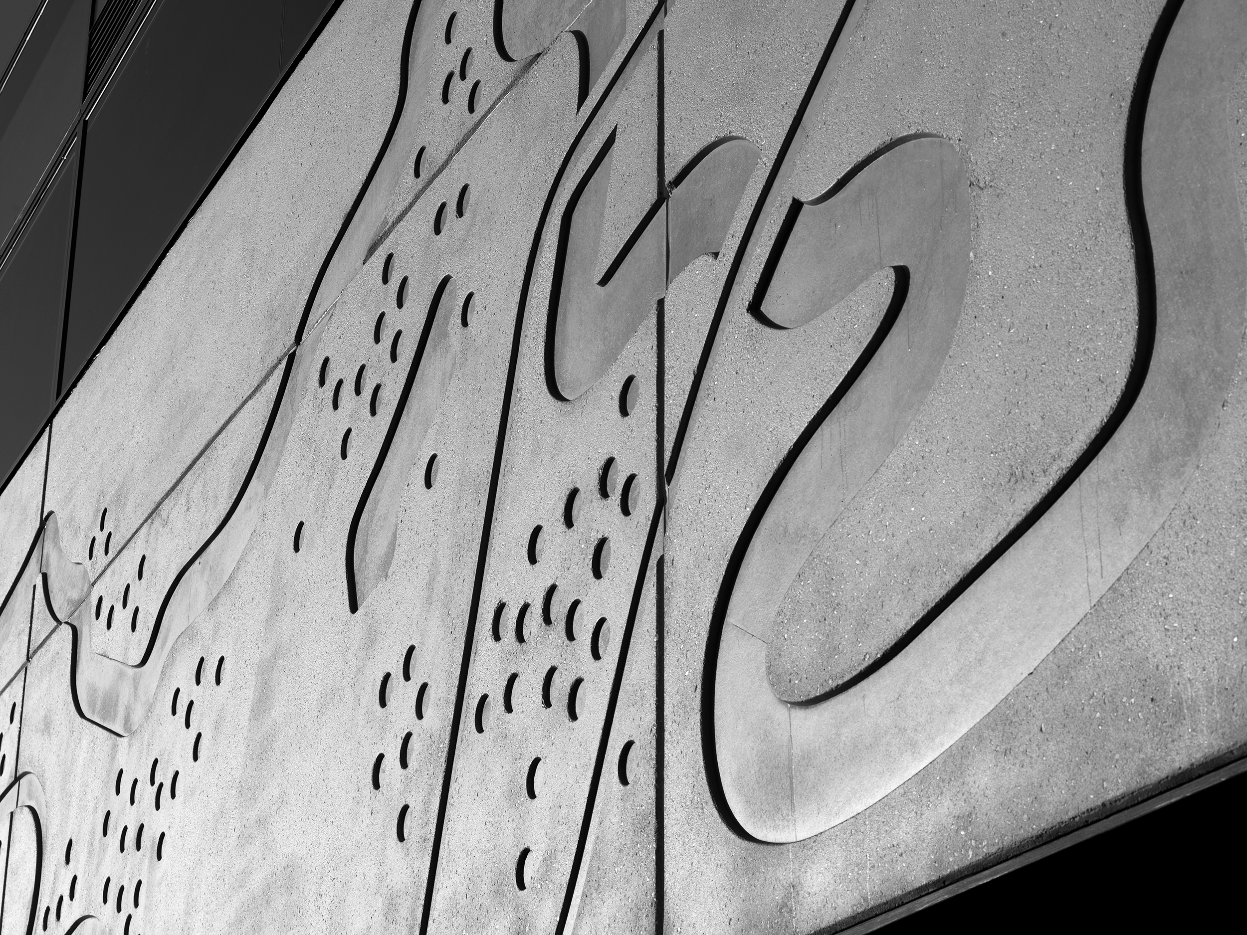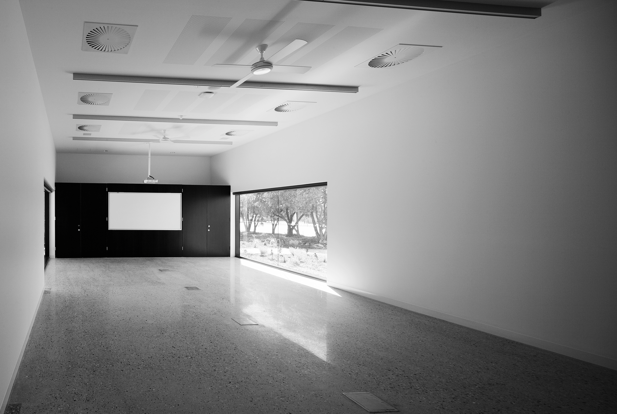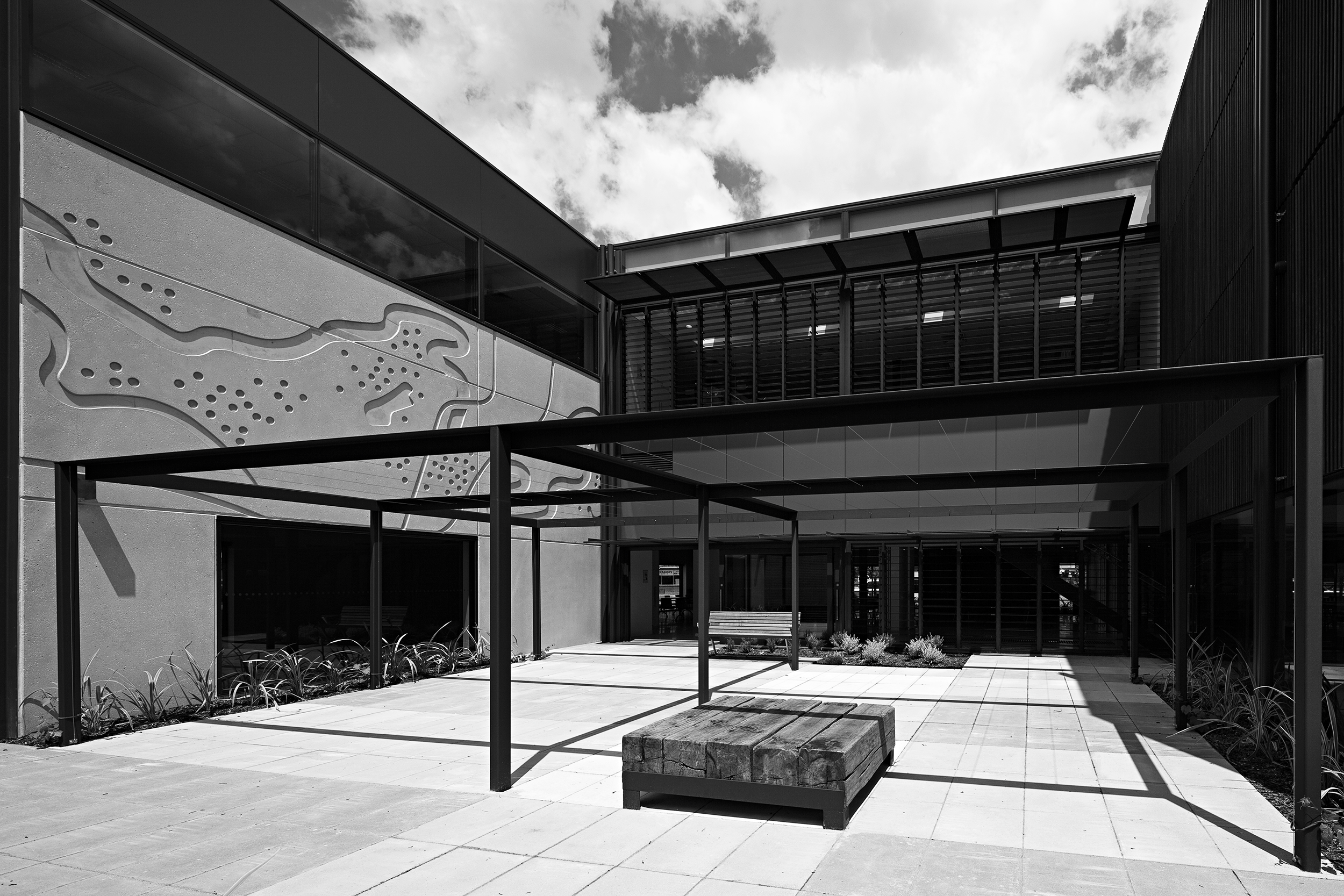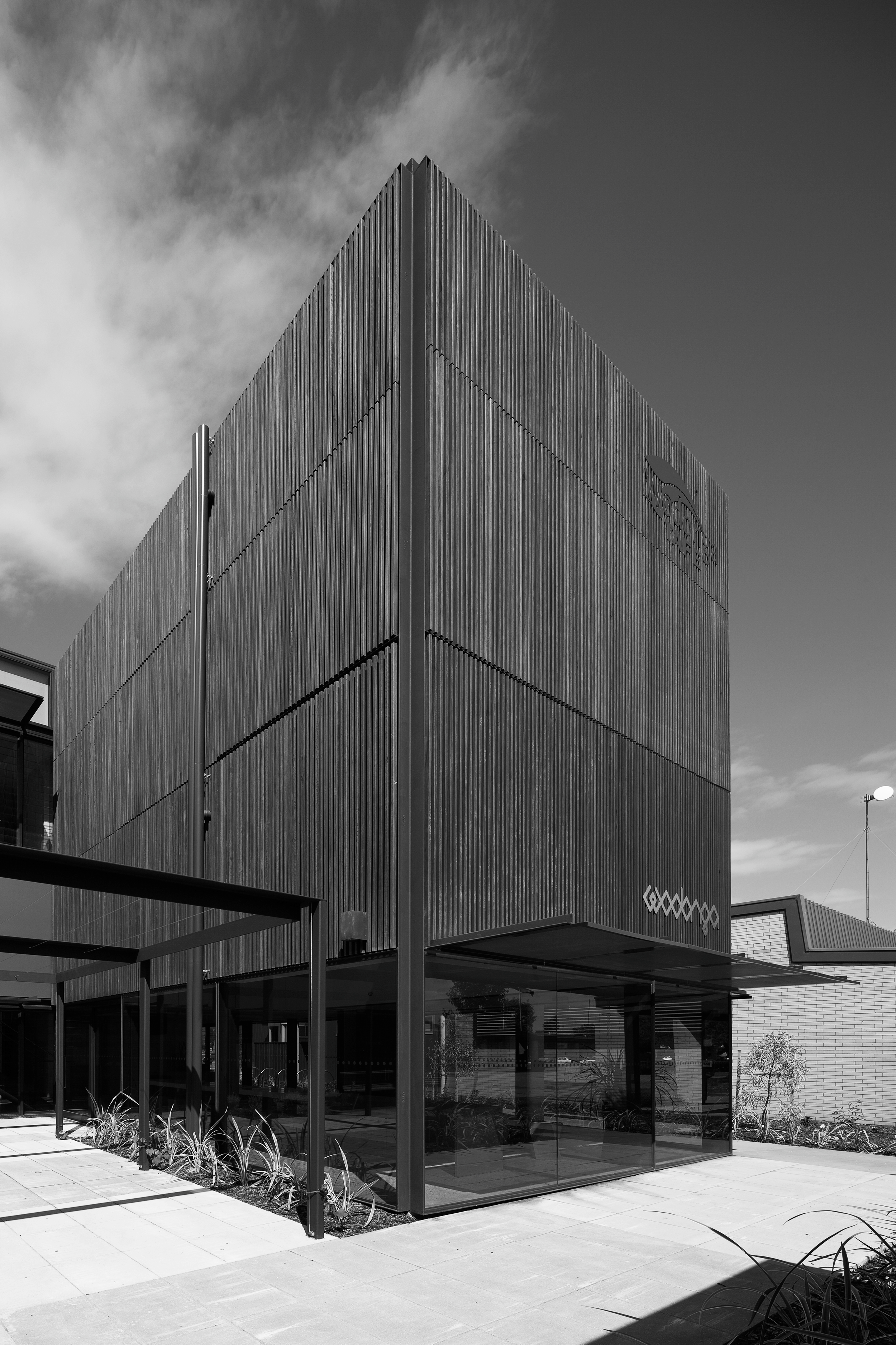 The project was designed, documented and constructed in only a year. It is composed of recyclable materials: glass, steel, timber battens and concrete panels, debossed with an abstraction of the Murray River’s trees and billabongs. It has been received enthusiastically by clients, users and critics.