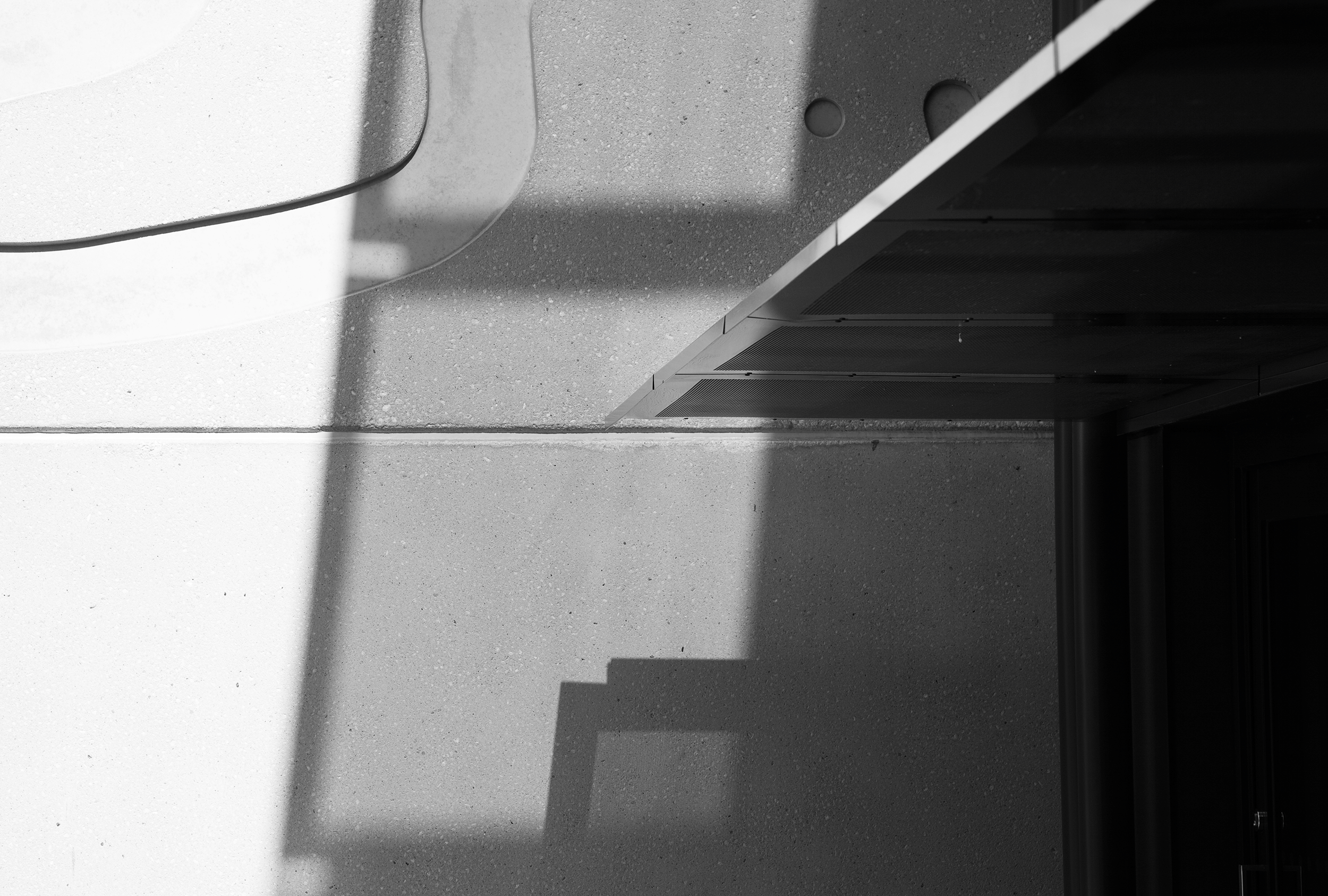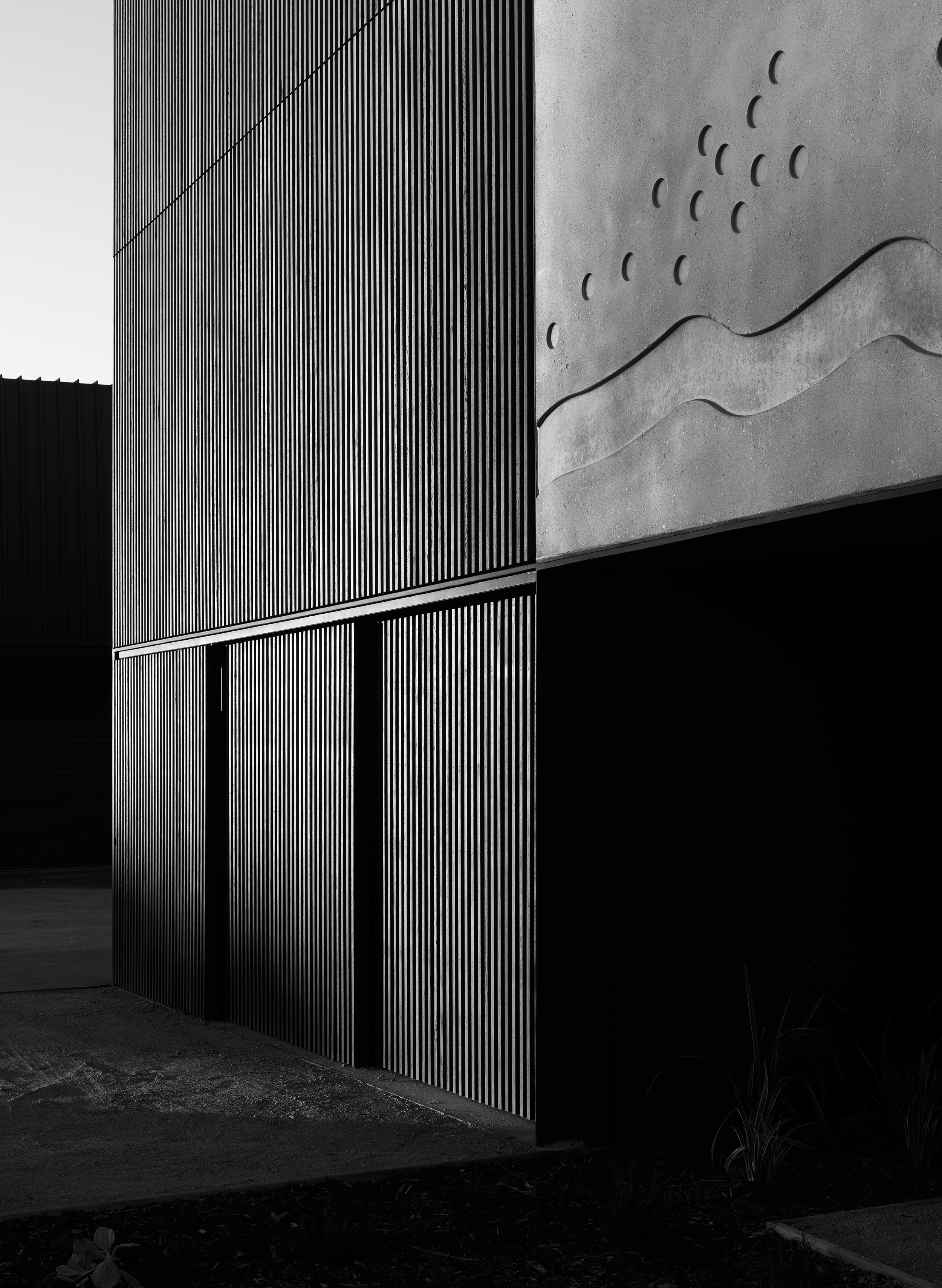 Generous glazing is a counterpoint to the embossed concrete panel walls and timber battens that extend across the western façade for sun protection. While the embossed concrete creates texture, it also depicts an abstracted aerial view of the Murray River system…