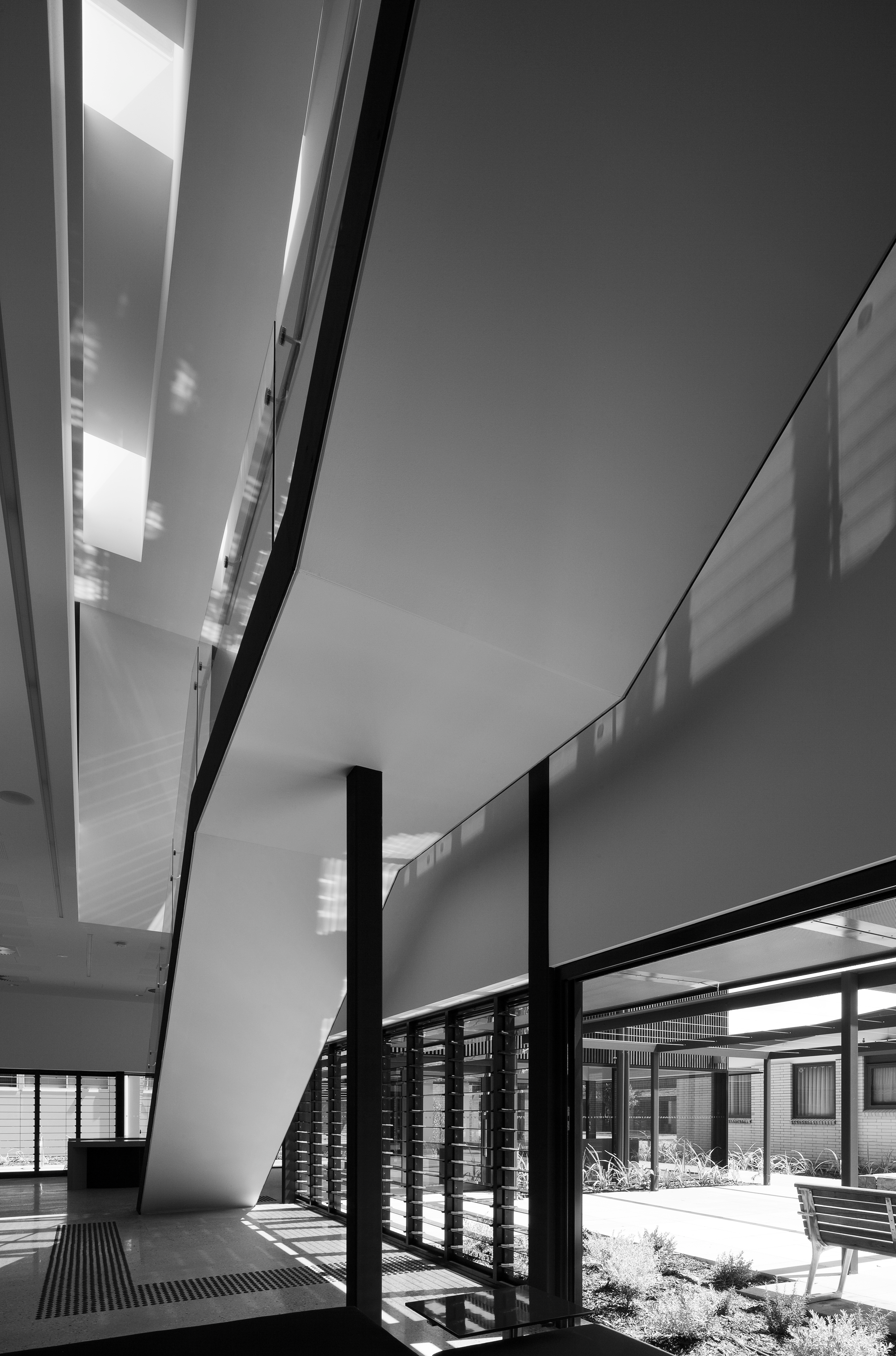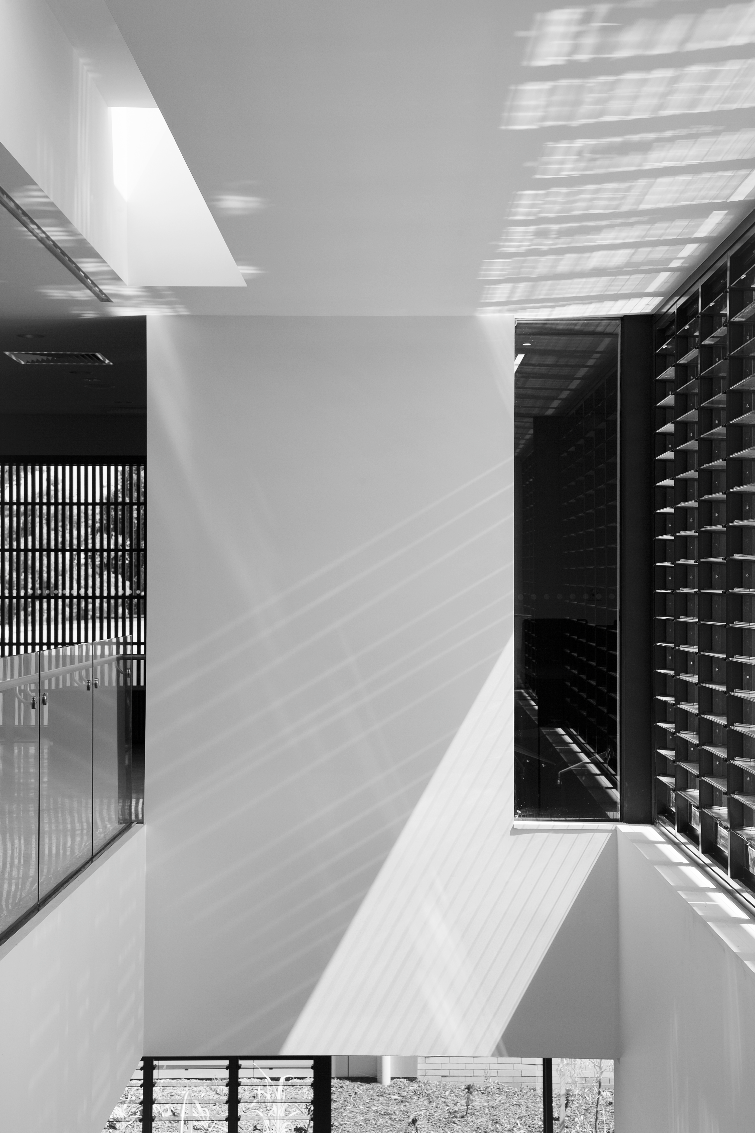 One of the most striking features in the atrium of the two-level building is the staircase, made of steel and glass. Framed by louvred windows and receiving additional light from skylights, this area is passively cooled during the warmer months, with hot air purged through [the] louvres.”